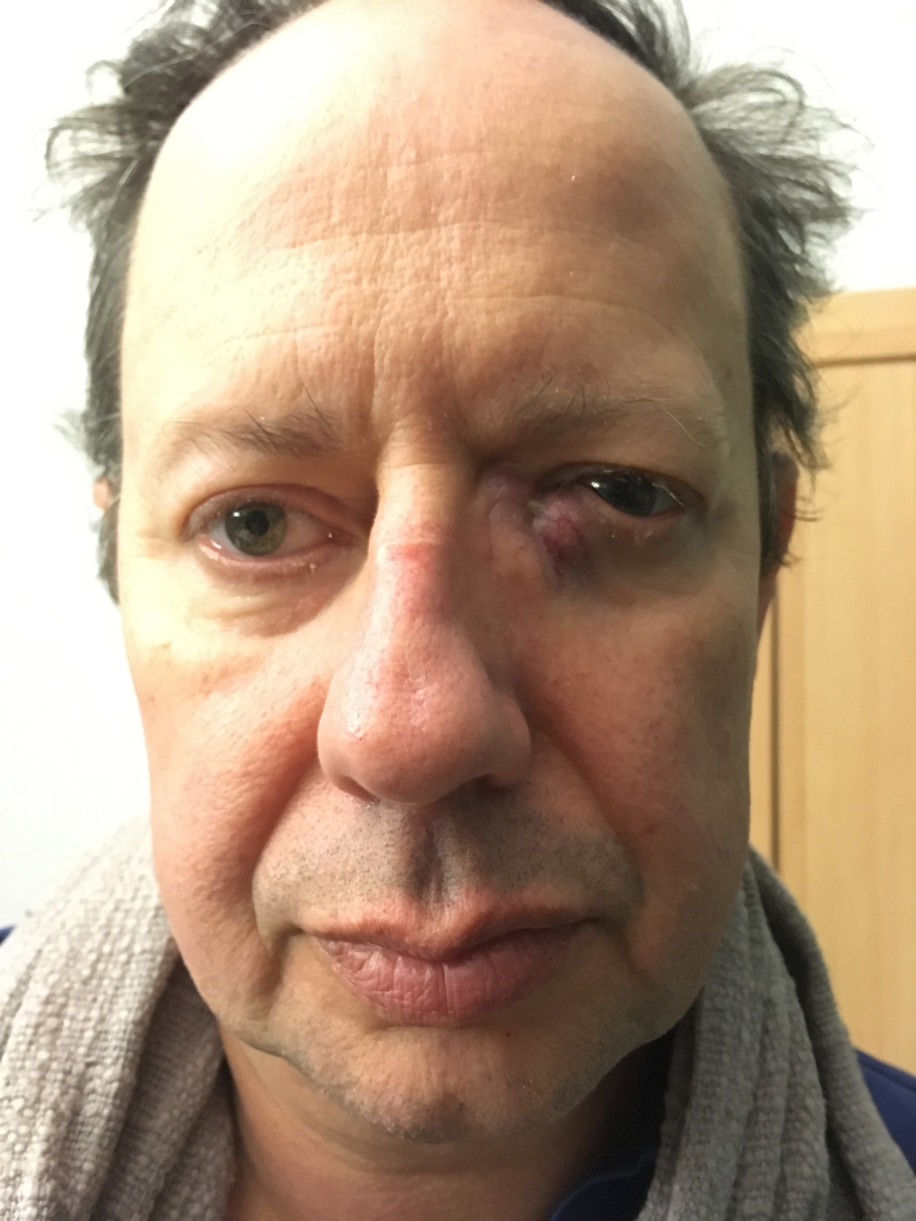 Als ik op zaterdag terug wakker word in de ochtend, blijkt dat ik een prachtig zicht heb vanuit mijn kamer op een parkje met dennenbomen naast het ziekenhuis. Terwijl de daken van het ziekenhuis zelf dan weer grasvelden lijken te zijn, op hun beurt volledig geïntegreerd in de natuur. Alleen de verpleger waarvan ik ‘s ochtends bij mijn vertrek afscheid neem, heeft diezelfde vreemde blik in zijn ogen als de krullenbol van radiologie. Bij hem is blijkbaar het zicht van mijn gezwollen oog alleen al voldoende om die op te roepen.